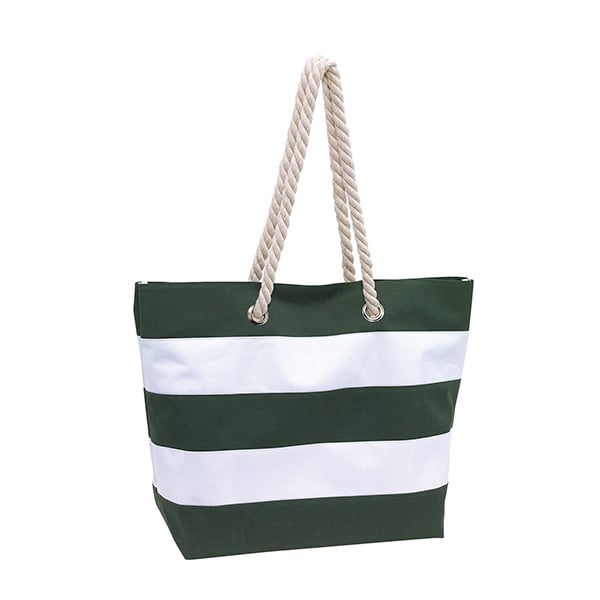 • Плажна чанта Sylt. Десенът е морско райе. Чантата е с голямо основно отделение с велкро затваряне. Включва допълнителен джоб с цип за ценни предмети. Двете дръжки са памучни, тип въже. Отворите за дръжките са с декоративни метални халки.