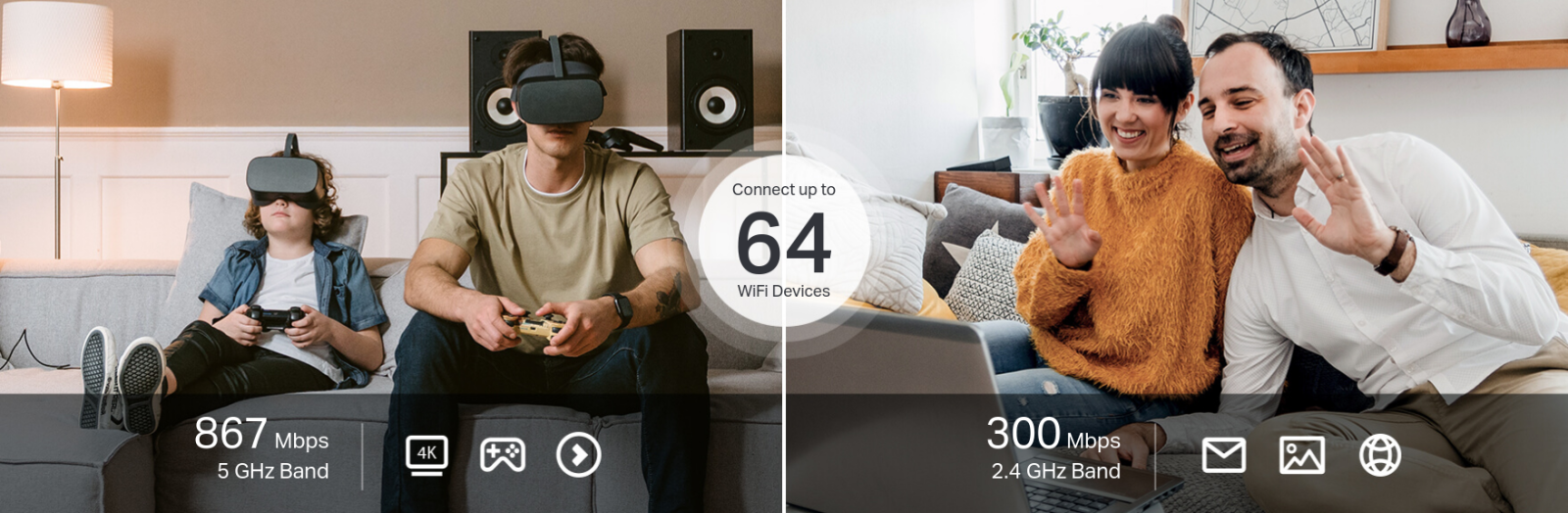 MR500 creates a reliable and blazing-fast network powered by 802.11ac Wi-Fi technology. The 2.4 GHz band delivers speeds up to 300 Mbps for everyday tasks like emailing and web browsing, while the 5 GHz band delivers speeds up to 867 Mbps—ideal for HD video streaming and lag-free online gaming.