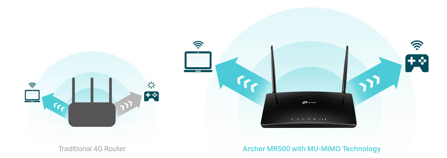 MU-MIMO technology enables multiple devices to connect to the internet at the same time, reducing wait time, increasing WiFi throughput for every device, and boosting the efficiency of each data stream. With MU-MIMO supported, Archer MR500 provides users a faster network, less interference, and lower latency.