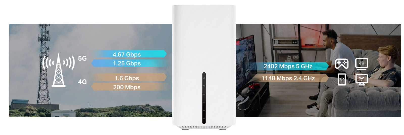 5G 4.67 Gbps 1.25 Gbps 4G 1.6 Gbps 200 Mbps 2402 Mbps 5 GHz 1148 Mbps 2.4 GHz