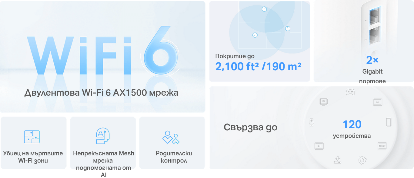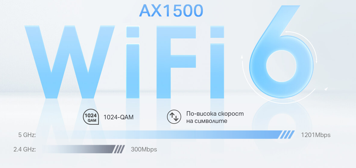 - По-бързи връзки: Wi-Fi 6 скорости до 1500 Mbps—1201 Mbps по 5 GHz и 300 Mbps по 2,4 GHz лента.
