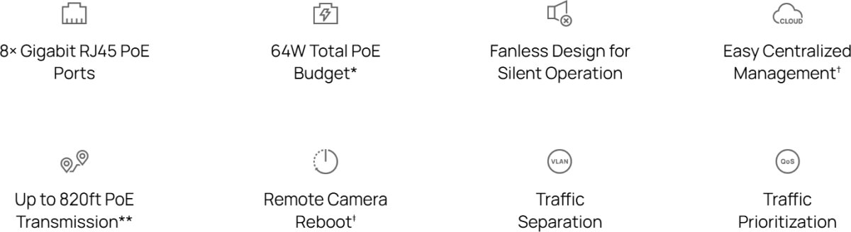 - (8) 10/100/1000Mbps RJ45 port, ((8) 802.3af/at-compliant PoE+)