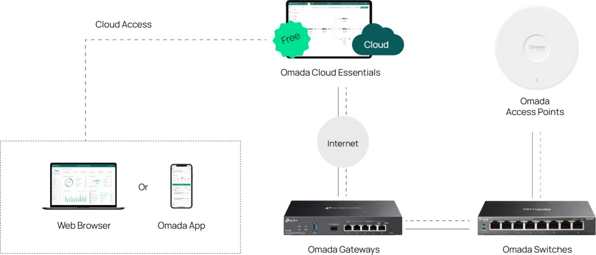 Omada Cloud Essentials is a free, easy-to-use cloud-based management option for the Omada networking system, covering access points, switches, and gateways. It enables simple, centralized network management and monitoring with essential features, making it ideal for surveillance networks and small businesses that don't require the complexity of larger operations.