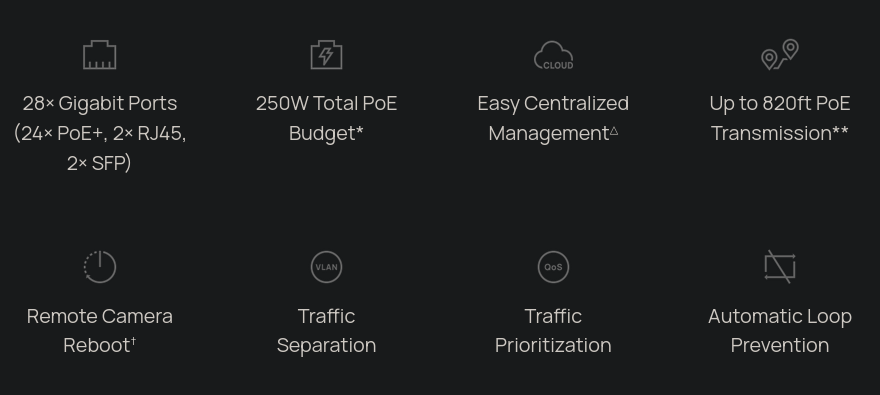 - Up to 820ft PoE**, Remote Camera Reboot†, QoS, and Port Isolation for reliable surveillance networking