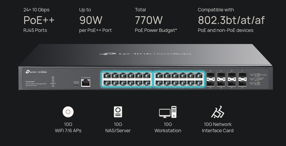 PoE Ports (RJ45) | Standard: 802.3bt/at/af compliant; PoE++ Ports (802.3bt/at/af PoE): 24 Ports, up to 90 W per port; Power Budget: 770 W |
