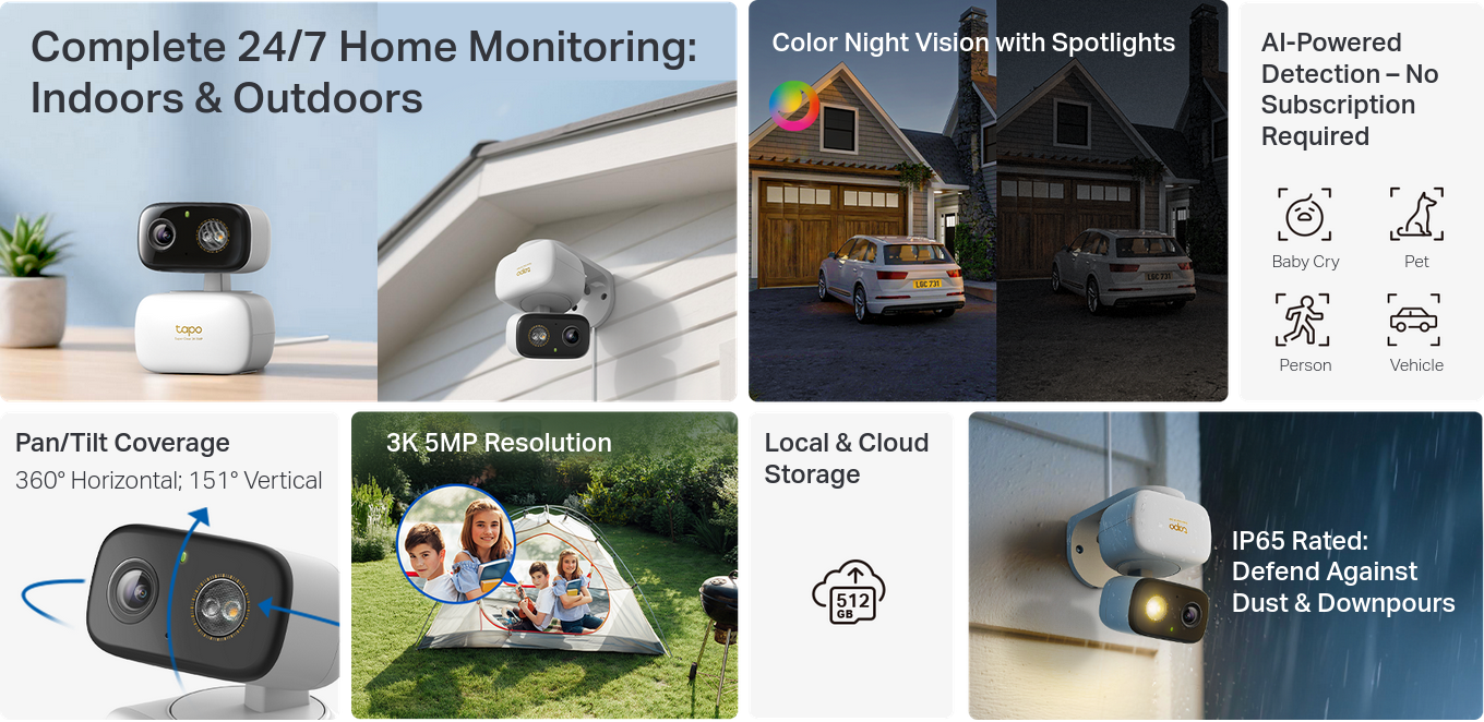 - Local and Cloud Storage: Save recorded videos to a microSD card (up to 512 GB) or by using Tapo Care cloud storage services.