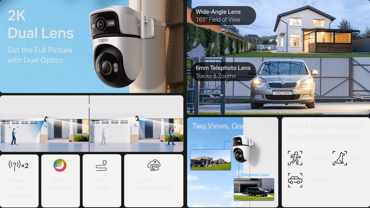 - Double 2K View: The fixed lens captures the big picture with wide angle, and the pan/tilt lens captures fine details with no distortion.
