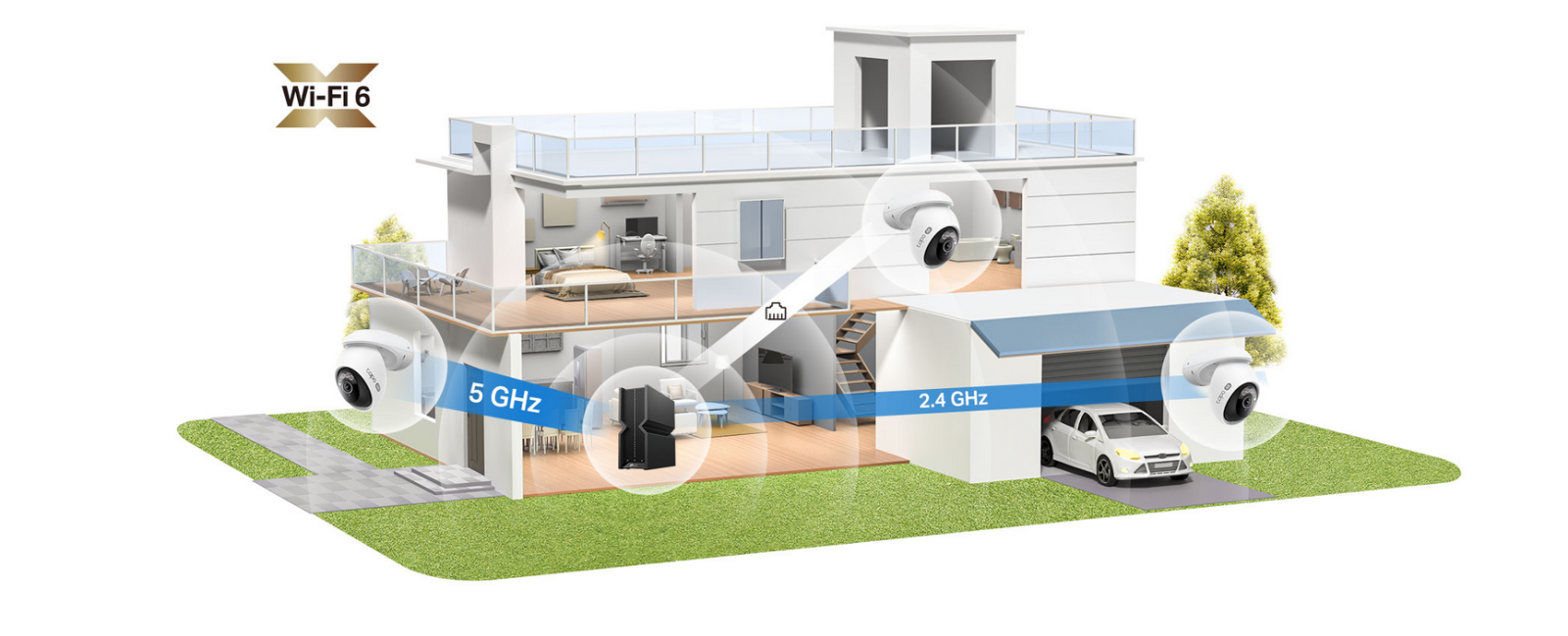 Connect the camera to a Wi-Fi 6 router and enjoy improved speed, greater stability, and reduced congestion in heavy bandwidth scenarios.The 5 GHz connection△ offers faster speed, while 2.4 GHz provides longer distance. Ethernet networking is also supported.