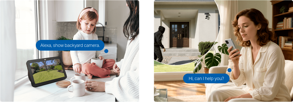 Pair with Smart Assistants Includes seamless integration with Amazon Alexa, Google Assistant, and Samsung SmartThings. View live streams on your Echo Show or Chromecast. | Two-Way Audio Built-in premium microphone and speakers ensure you can hear and be heard with exceptional clarity. |