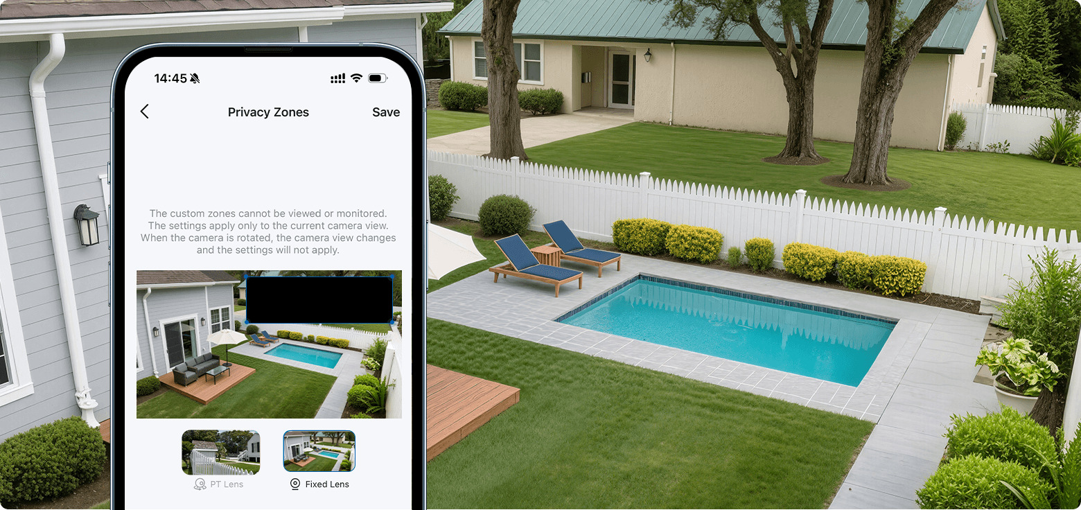 Take control of your privacy by defining customizable privacy zones. This feature allows you to block recording in designated areas within the camera's view, ensuring personal spaces and neighbor’s yard remain unmonitored.