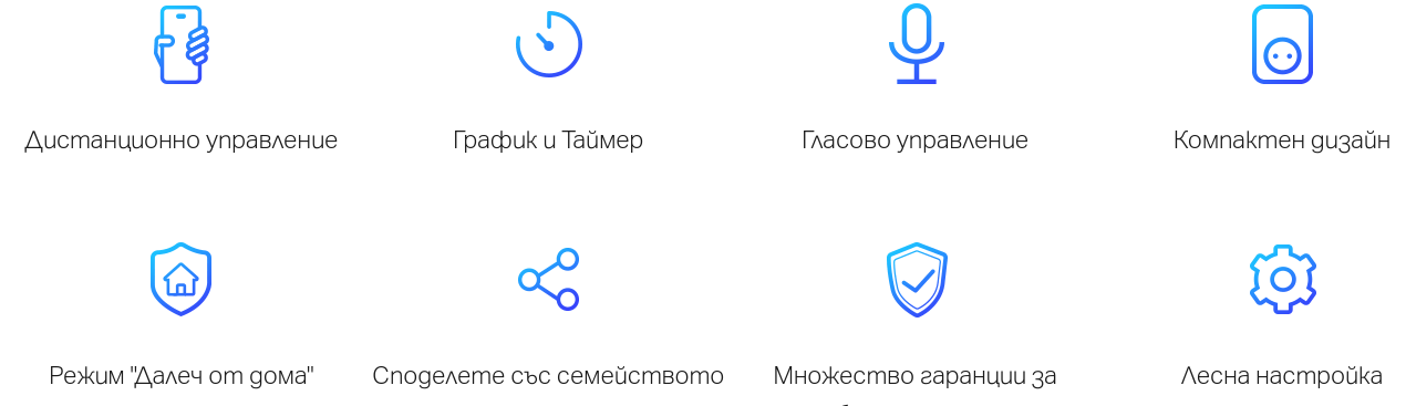 Функциите "график" и "таймер" позволяват да създавате седмични графици и планове за обратно отброяване. Цялата свързана електроника автоматично ще работи в предварително зададено време. Живейте интелигентно, удобно и икономично.