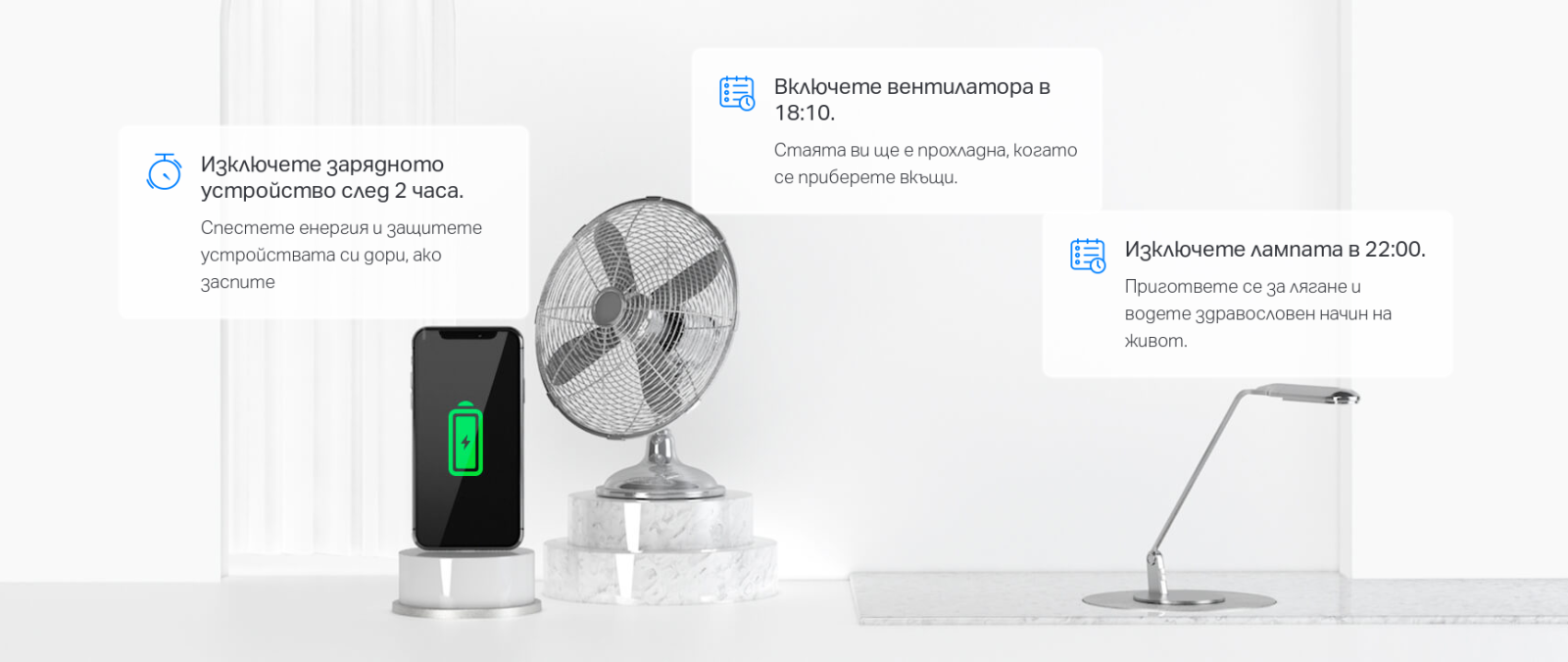 Функциите "график" и "таймер" позволяват да създавате седмични графици и планове за обратно отброяване. Цялата свързана електроника автоматично ще работи в предварително зададено време. Живейте интелигентно, удобно и икономично.