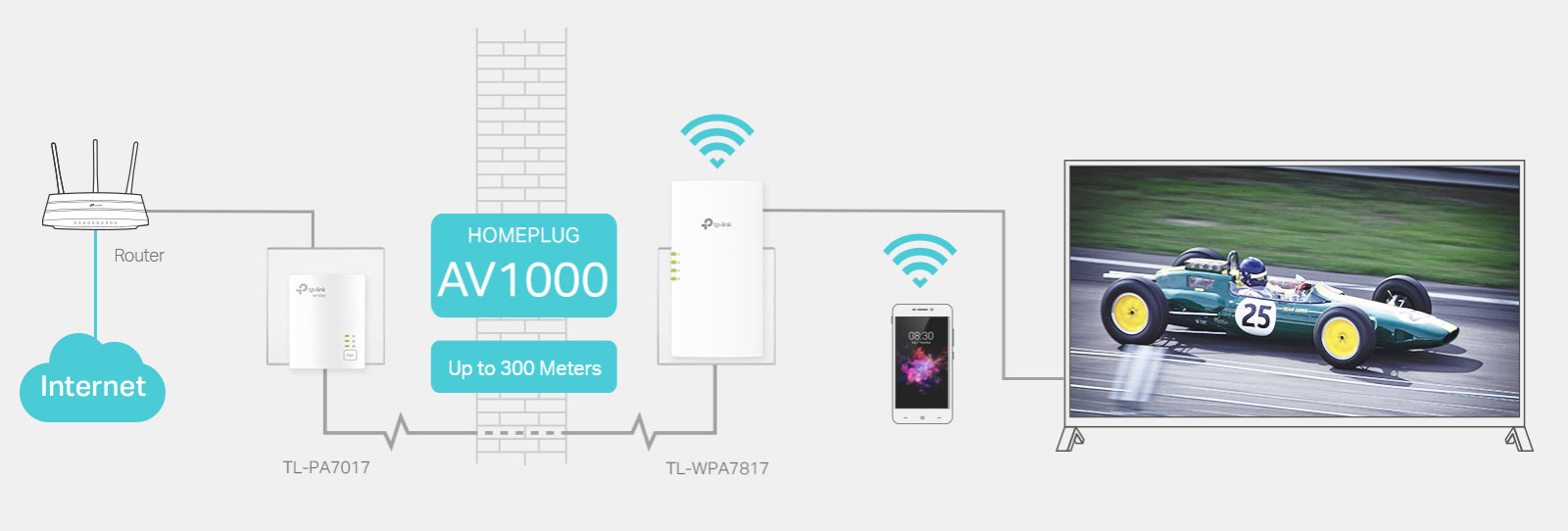 Using advanced HomePlug AV2 technology, TL-WPA7817 KIT ensures stable and high-speed Wi-Fi and wired connection, providing data transmissions of up to 1000 Mbps* over the electrical wiring for ranges up to 300 meters†. Stream in HD, game online and download large files without interruption thanks to reliable powerline links.