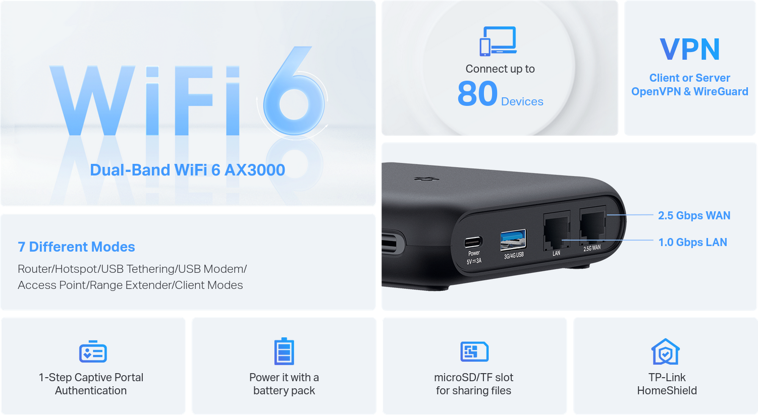- Enjoy Reliable Network Anywhere: Supporting multiple modes (Router / USB Tethering / 3G-4G USB Modem / Hotspot / Access Point / Range Extender / Client), TL-WR3002X allows you to create Wi-Fi in various scenarios at home, hotel rooms or on the road.