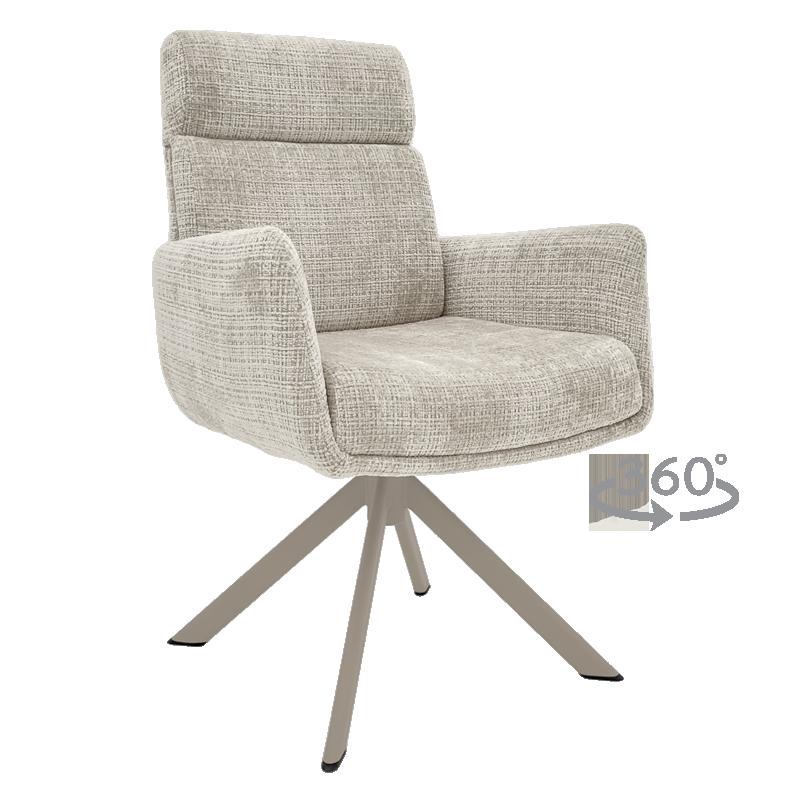 Трапезен стол TORVA е олицетворение на модерния комфорт, предлагайки елегантен дизайн с удобни подлакътници и мека тапицерия от издръжлива дамаска. За максимално удобство при продължително седене, седалката е подсилена със система от покет пружини и разполага с функция за люлеене. Здравата основа от праховобоядисан метал позволява пълно въртене на 360° и включва механизъм за автоматично връщане в изходна позиция. Този стол е създаден да издържи на натоварване до 120 кг, което го прави отличен и стабилен избор за всяка съвременна трапезария. Пълна информация за размерите и характеристиките на модела ще намерите в таблицата в таб/поле "Техническа информация"