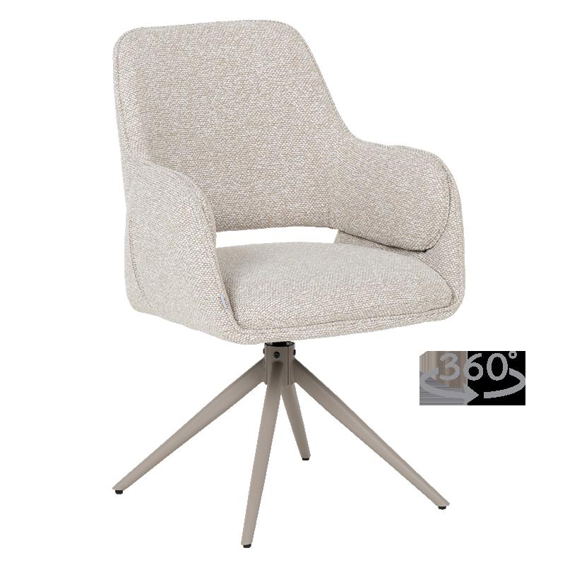 Трапезният стол Vinto съчетава иновативни функции с елегантен дизайн, за да предложи превъзходно ниво на комфорт във Вашата трапезария. Моделът се отличава с мека седалка, в която са вградени покет пружини за оптимална опора, тапицирана с качествена дамаска в цвят крем. Стабилната основа от прахово боядисан метал разполага с механизъм за пълно въртене на 360°, което осигурява голяма свобода на движение. Със своята здрава конструкция и ергономична форма, столът гарантира издръжливост при натоварване до 120 кг. Пълна информация за размерите и характеристиките на модела ще намерите в таб/поле "Техническа информация".