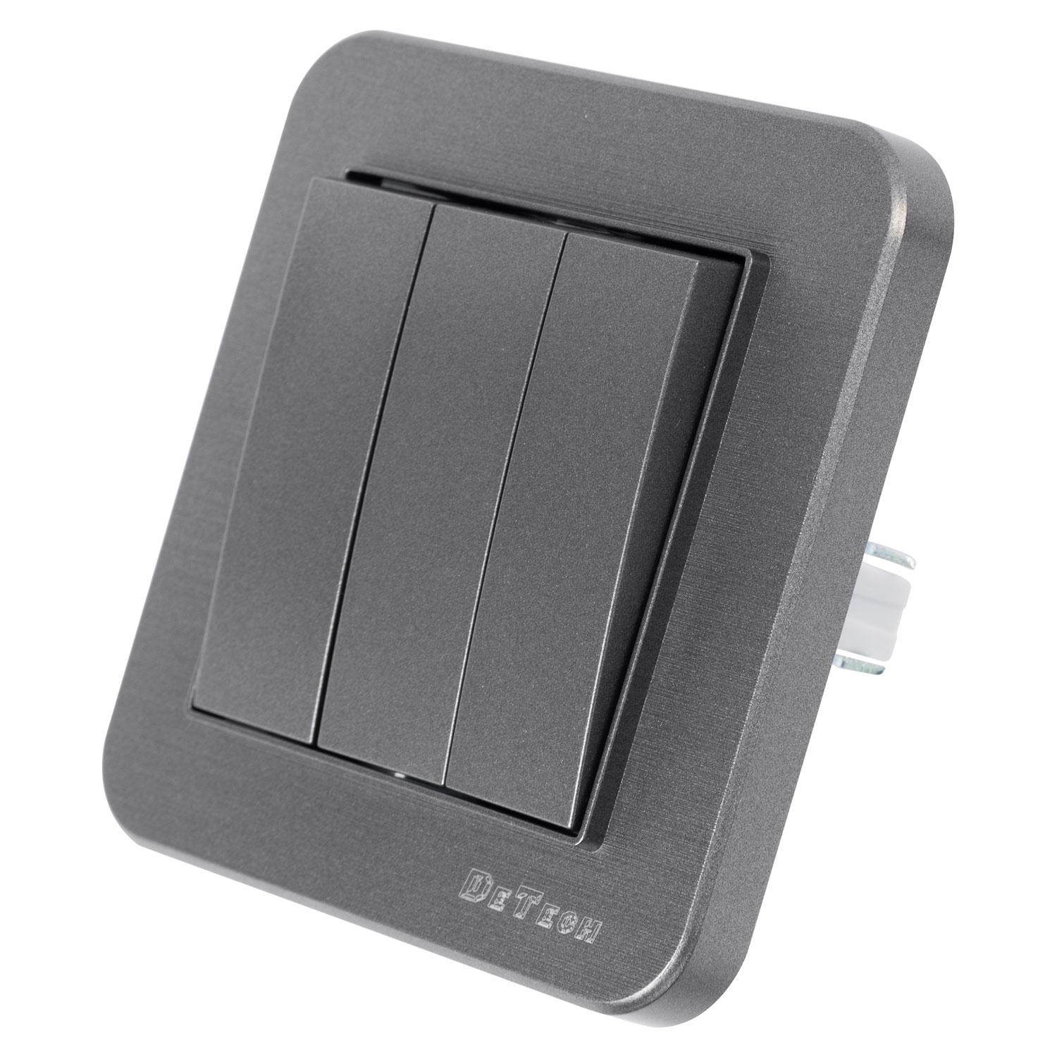 Троен ключ за осветление DeTech DE-9223-03 (схема 1) с класически квадратен дизайн и декоративна рамка, в сив цвят.