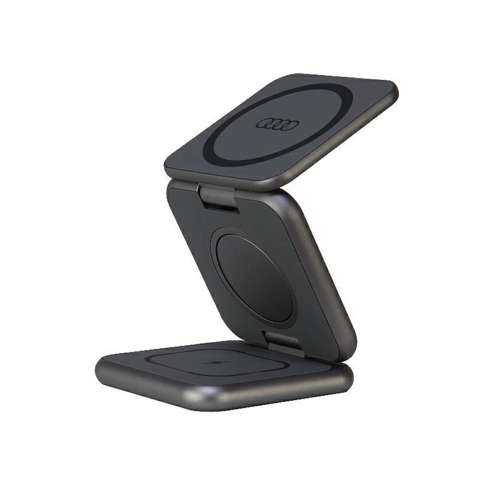 Тройна поставка (пад) за безжично зареждане за iPhone с MagSafe, Apple Watch, AirPods и Qi съвместими мобилни устройства - Audi 3-in-1 Wireless Charger Foldable Gray Big Logo 22.5W (черен)