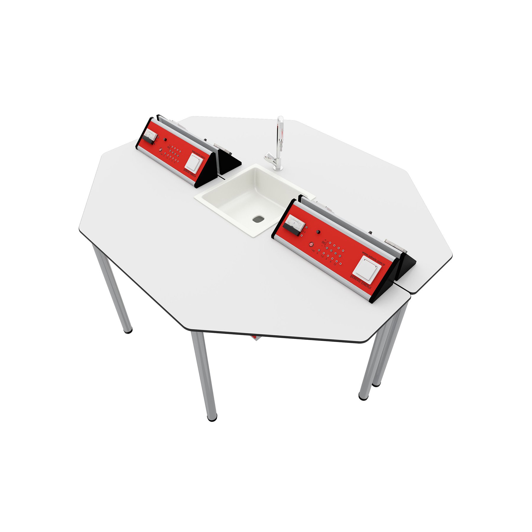 » Ученическа маса RFG Hexa, лабораторна, над VII клас, 170 х 140 х 75 cm, HPL плот, метални крака, червено-бяла, сглобена мостра