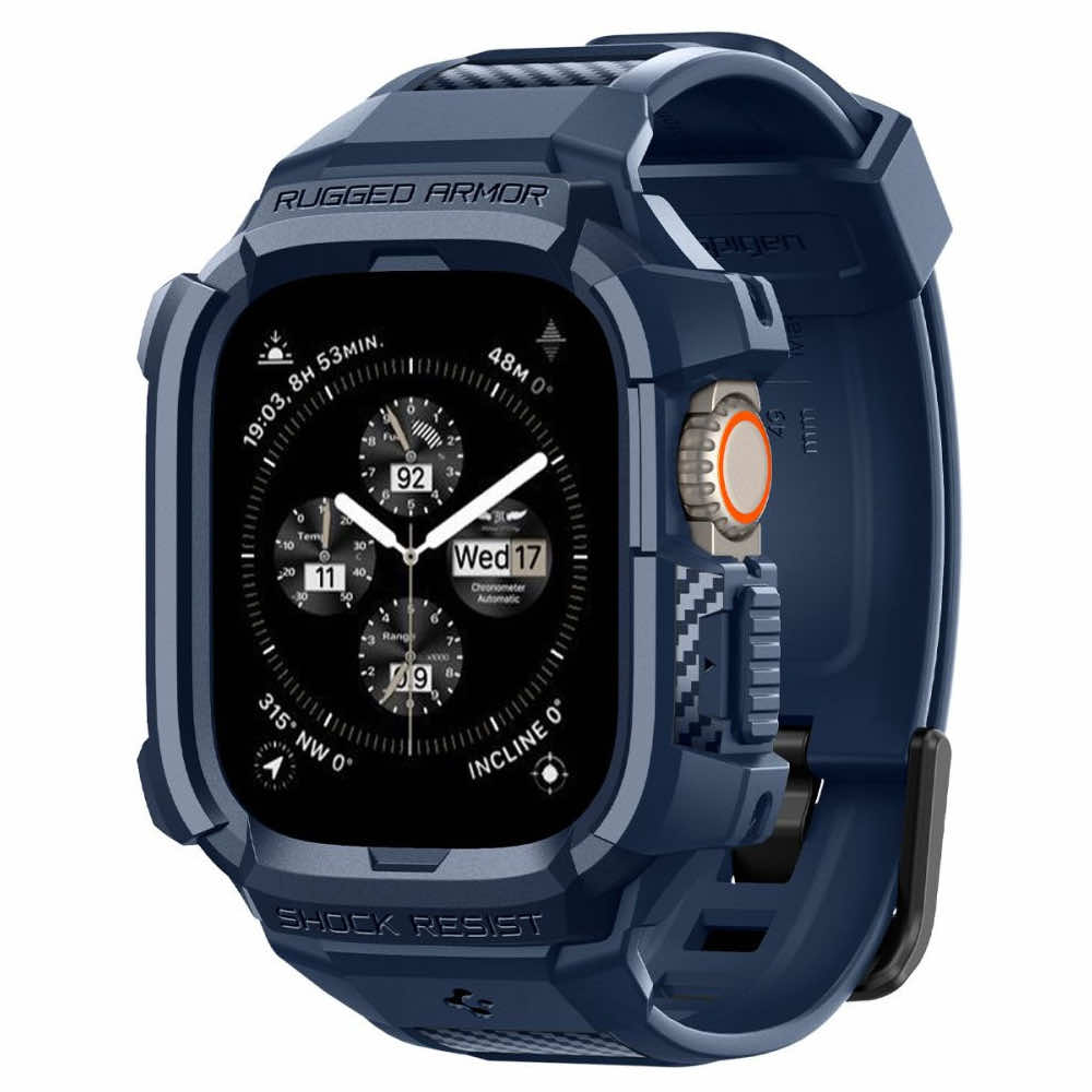 Удароустойчив TPU кейс с вградена каишка за Apple Watch Ultra, Ultra 2 49мм - Spigen Rugged Armor Case Pro (тъмносин)