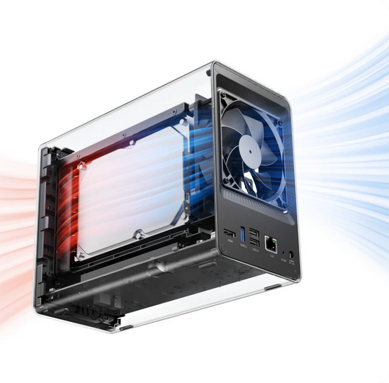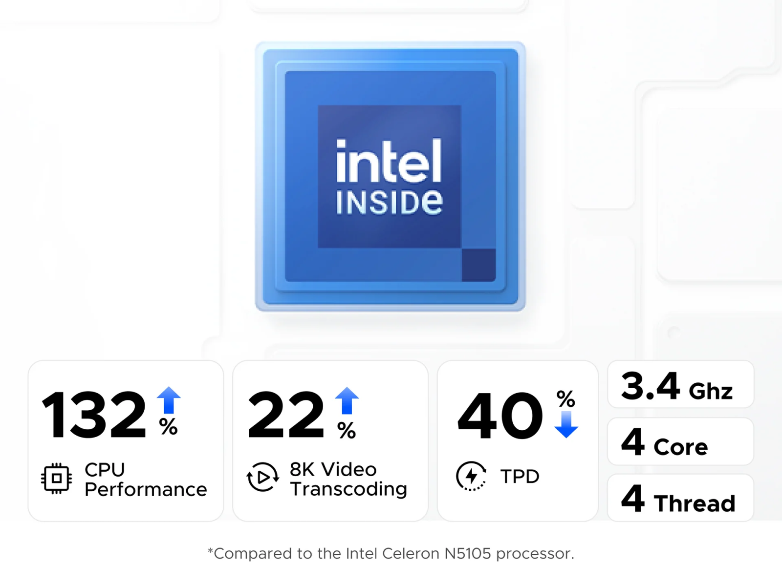 The 12th Gen Intel N100 processor offers robust performance for 4K streaming, multi-user access, and fast backups, all while maintaining low power consumption.