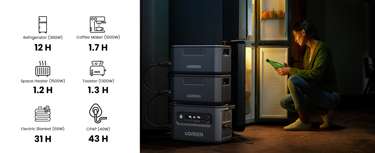 - Expandable Capacity from 2-12kWh: Ugreen PowerRoam 2200 solar generator can expand capacity from 2kWh to 12kWh for battery backup power supply with 5 expansion batteries.