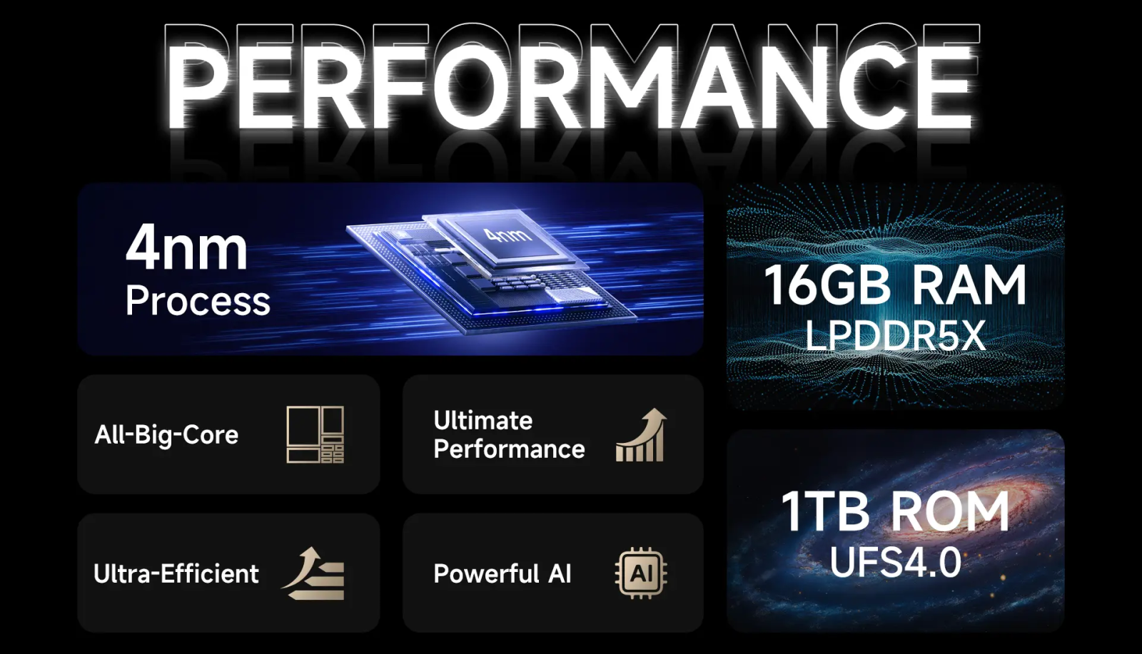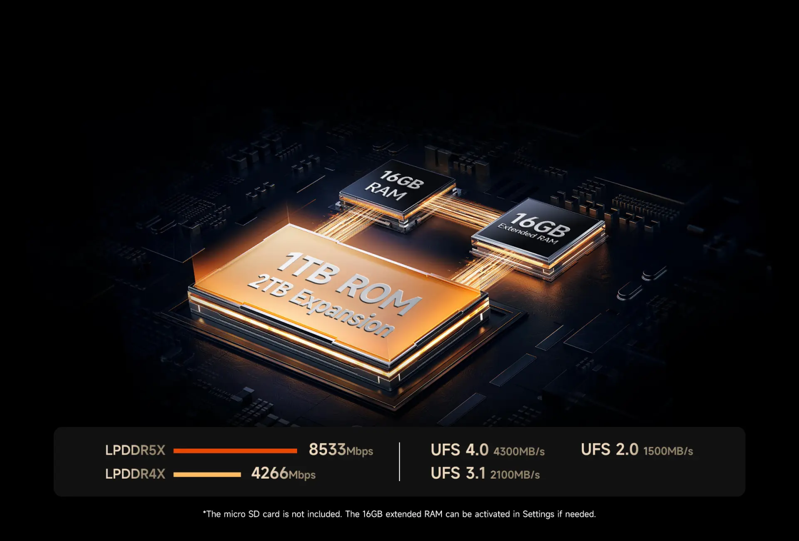 LPDDR5X doubles the read speed to 8533 Mbps, up from LPDDR4X's 4266 Mbps, while UFS 4.0 offers write speeds of 4300MB/s, twice as fast as UFS 3.1. With 16GB of RAM and 1TB of storage, you'll enjoy a seamless experience, keeping apps active and worry-free about storage.