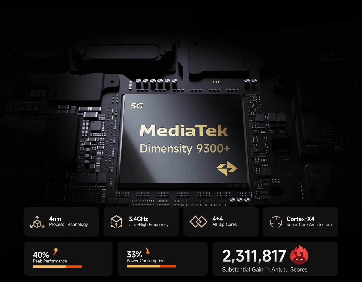 | Processor | MediaTek Dimensity 9300+ (MT6989W); Octa-core: 1×Cortex-X4 @3.4GHz, 3×Cortex-X4 @2.85GHz, 4×A720 @2.0GHz; GPU: Immortalis-G720 @1.3GHz; AI: MediaTek NPU 790 |