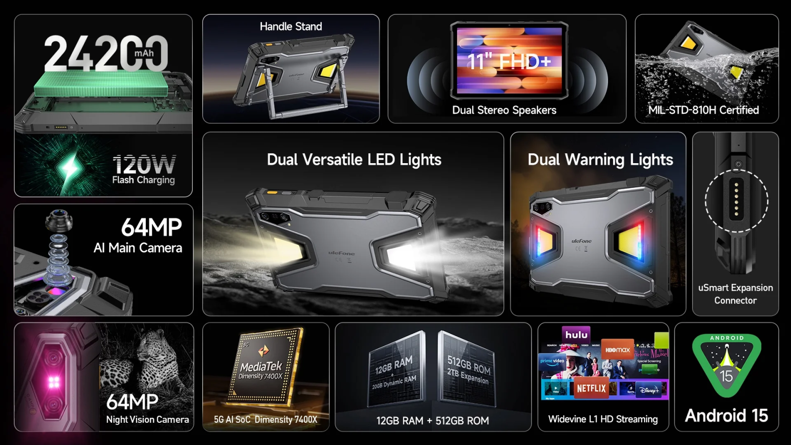 Beyond a rugged tablet, Armor Pad 5 Pro is a powerful portable multi-function LED lights. With 377 LED beads producing 1000 lumens per side, you can switch between warm or white light to suit any situation. Powered by a massive 24200mAh battery, the light has longer lasting. In emergencies, simply activate the flashing mode to ensure you're seen. It's ideal for camping, or use in a shed or garage.