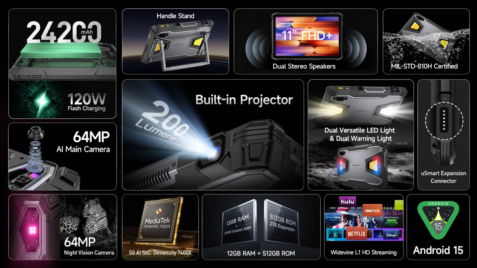 More than just a tablet, the Armor Pad 5 Ultra features an integrated DLP projector with 200 lumens of ultra-bright picture. It's completely portable, requiring no plug-in, effectively transforming into a portable TV. Easily cast movies, presentations, engineering drawings, or photos freely onto any surface. With a sharp image resolution of 960 x 540, your content comes to life with impressive clarity.