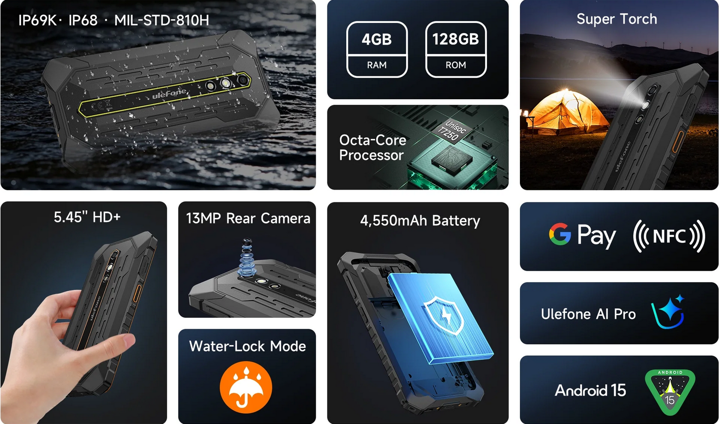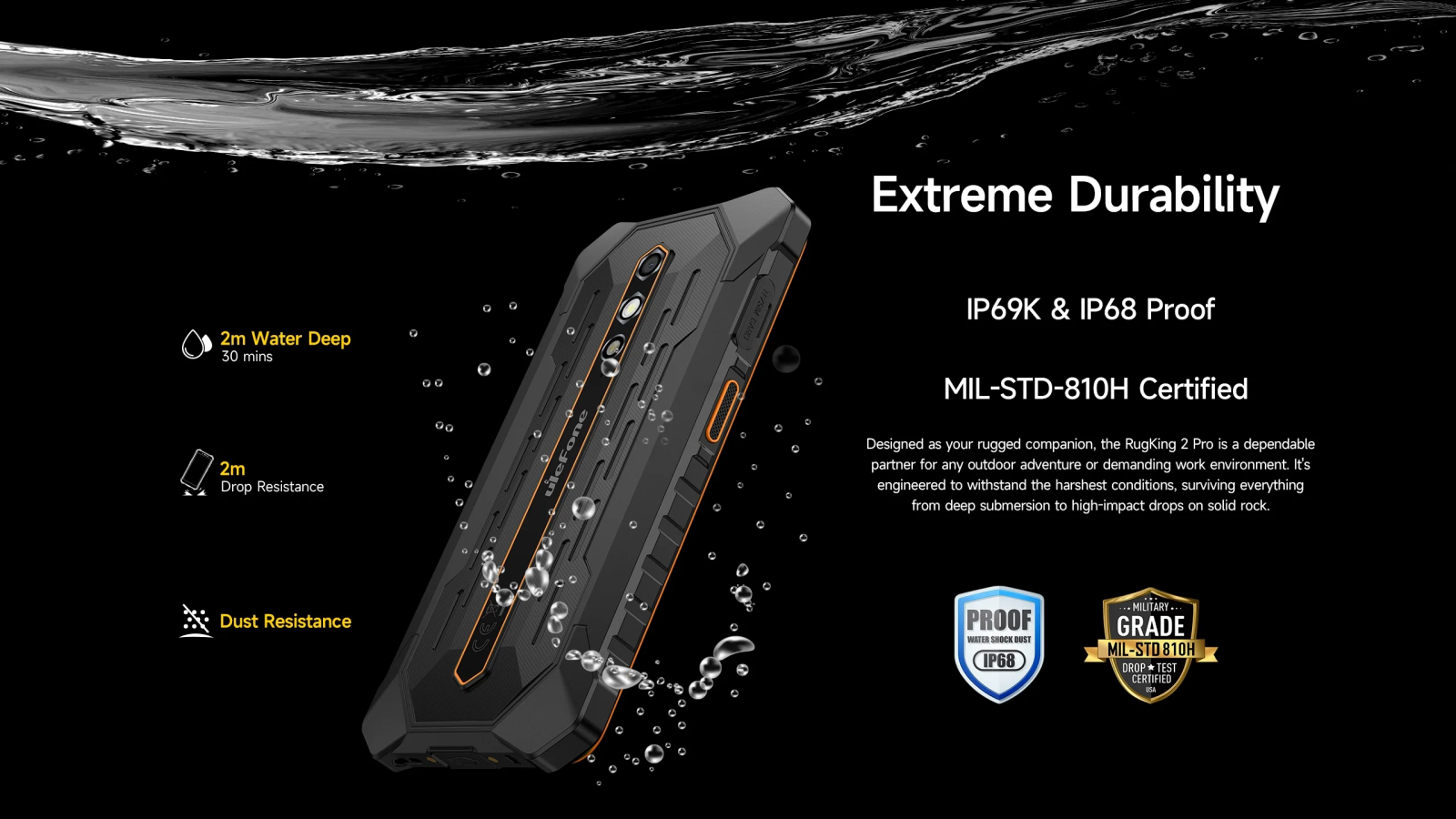 | Rugged Rating | IP68 (2m / 30 min), IP69K |