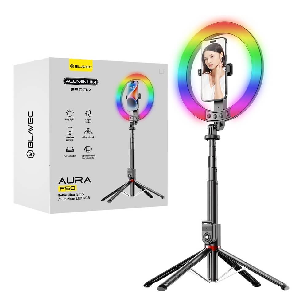 Универсален трипод с LED светлина с RGB подсветка за смартфони - Blavec Aura Selfie Ring Lamp LED RGB Light with Tripod (33.5 см) (черен)