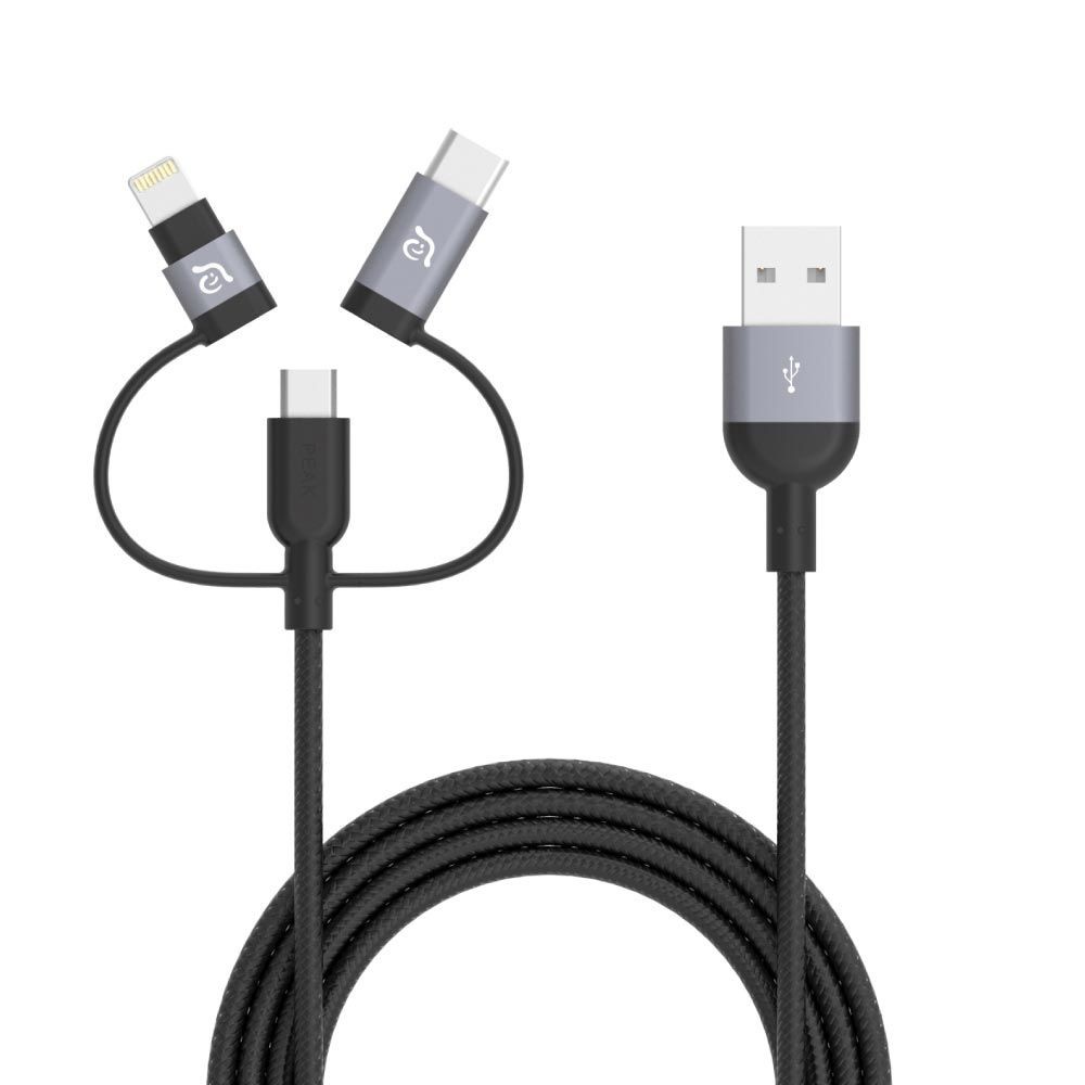 PeAk II Trio комбинира MFi сертифициран Lightning, USB Type-C и Micro USB - в един кабел
