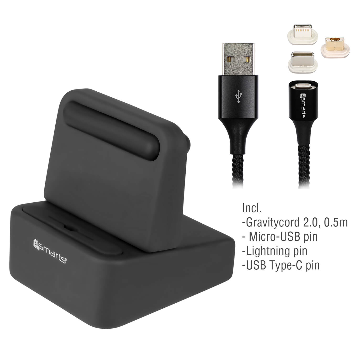 В комплекта: - 4smarts Universal Charging Station WireDock - Четири държачи за кабели в различни размери - 4smarts GravityCord 2.0 - 3 x GravityCord конектора: USB-C, Micro-USB и Lightning