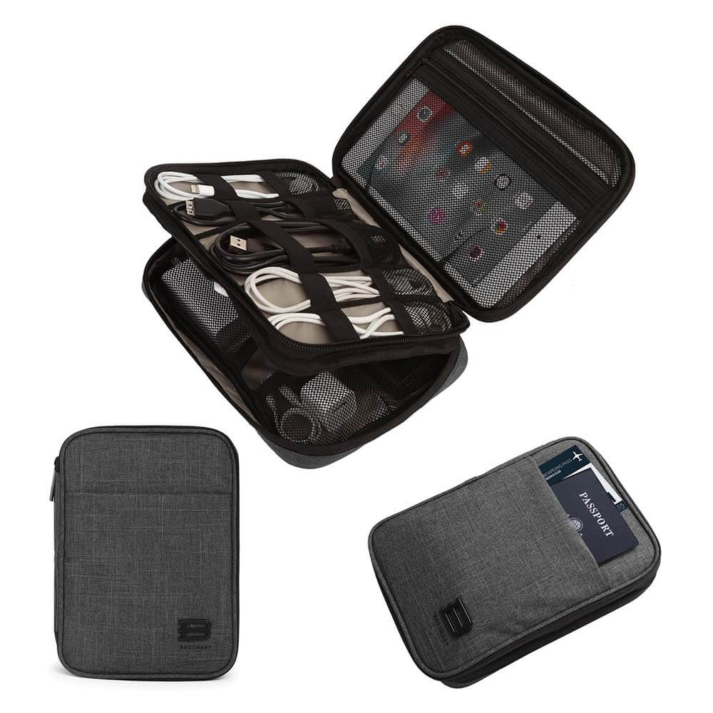 Органайзер с две отделения, който може да събере множество електронни аксесоари и устройства като таблет, смартфон, външна батерия, кабели, слушалки, MicroSD карти, флашки, адаптери и др.
