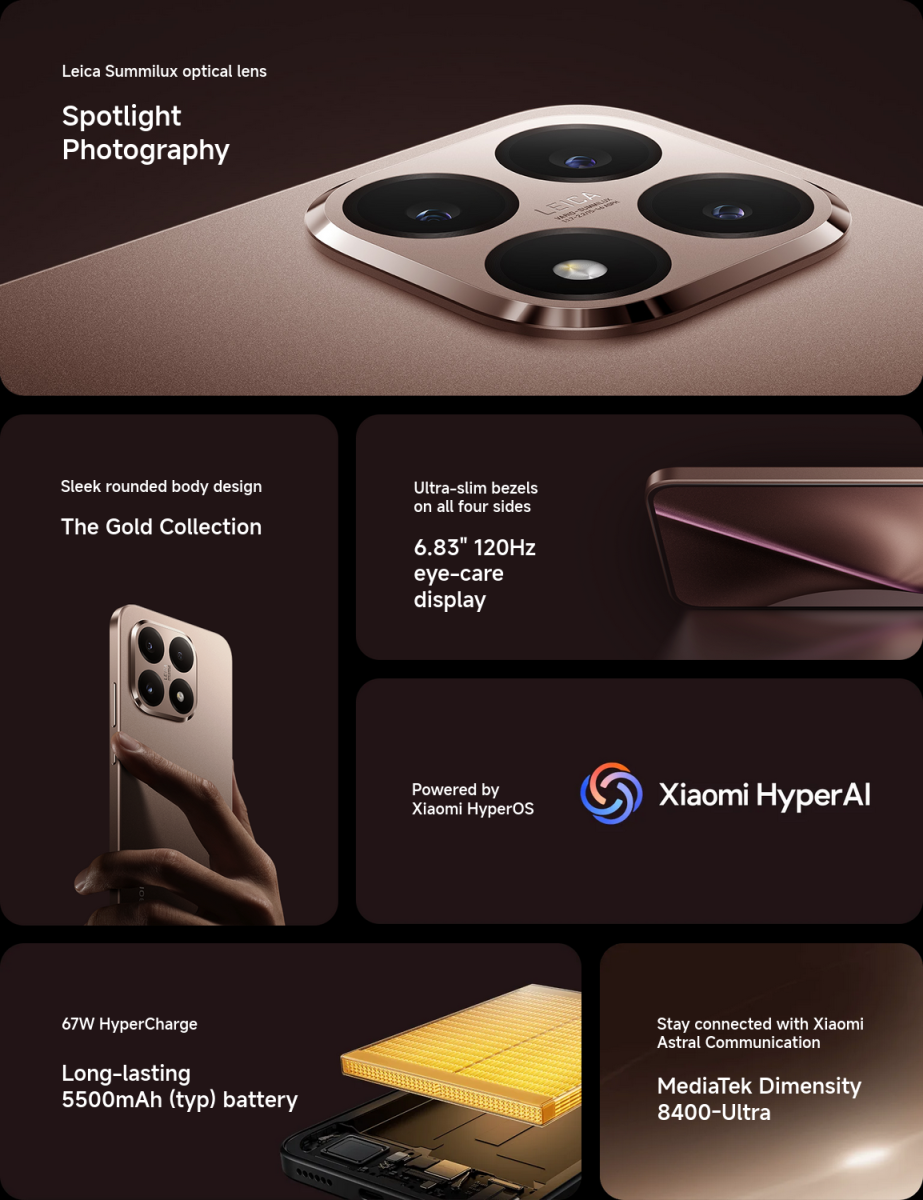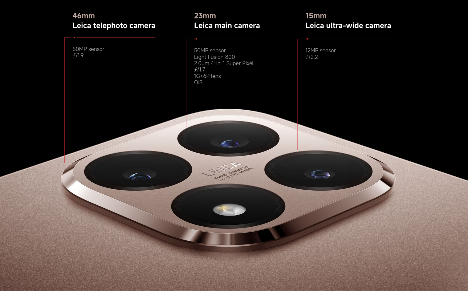 Rear Camera System | Leica Summilux Optics (VARIO-SUMMILUX 1:1.7-2.2/15-46 ASPH) Main Camera: 50 MP (Light Fusion 800 sensor, f/1.7, OIS, 23 mm eq.) Telephoto: 50 MP (f/1.9, 46 mm eq.) Ultra-Wide: 12 MP (f/2.2, 15 mm eq., 120° FoV) Features: Leica Authentic & Vibrant Looks |
