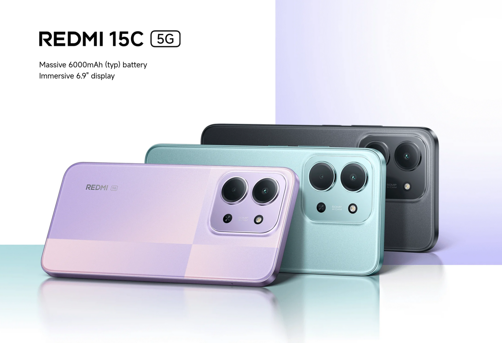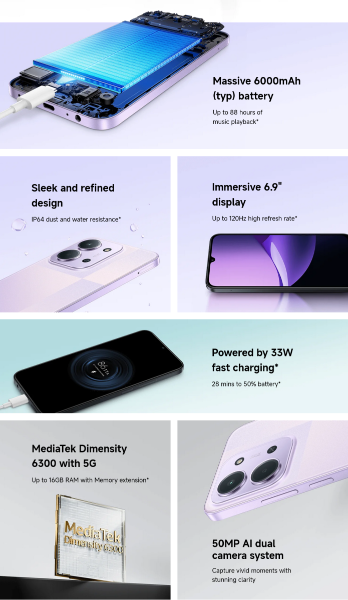 Powered by the MediaTek Dimensity 6300 with a 6nm process, REDMI 15C 5G delivers smooth multitasking and excellent energy efficiency. Enjoy strong performance with longer battery life—all in one sleek device.
