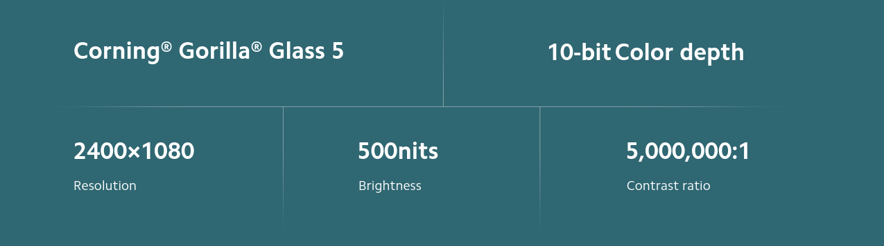 6.67" FHD+ AMOLED display Refresh rate: Up to 120Hz Brightness: 500nits brightness Color depth: 10-bit Contrast ratio: 5,000,000:1 Resolution: 2400 x 1080 DCI-P3 wide color gamut Corning® Gorilla® Glass 5 protection 1920Hz PWM dimming| TÜV Rheinland Low Blue Light Certification (Hardware solution) | TÜV Rheinland Circadian Friendly Certification | TÜV Rheinland Flicker Free Certification | Reading mode
