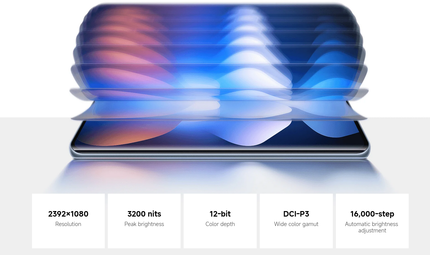 | Display | 6.77″ AMOLED; Resolution: 2392 × 1080; Refresh rate: up to 120 Hz; Touch sampling rate: 240 Hz; Brightness: 3200 nits peak / 800 nits (typ); Colour depth: 12-bit; Contrast ratio: 8,000,000:1; DCI-P3 wide colour gamut; Sunlight display; Reading mode; 3840 Hz PWM dimming; 16,000-level brightness adjustment; Screen-to-body ratio: 93%; TÜV Rheinland Low Blue Light (Hardware Solution), Circadian Friendly & Flicker-Free certified (Data from Xiaomi Internal Labs) |