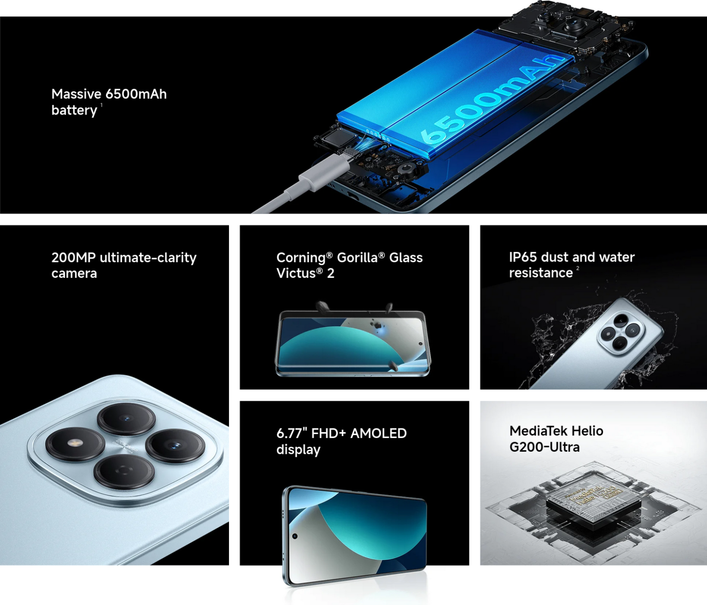 | Battery & Charging | 6500 mAh (typ) battery45 W turbo charging45 W in-box charger |
