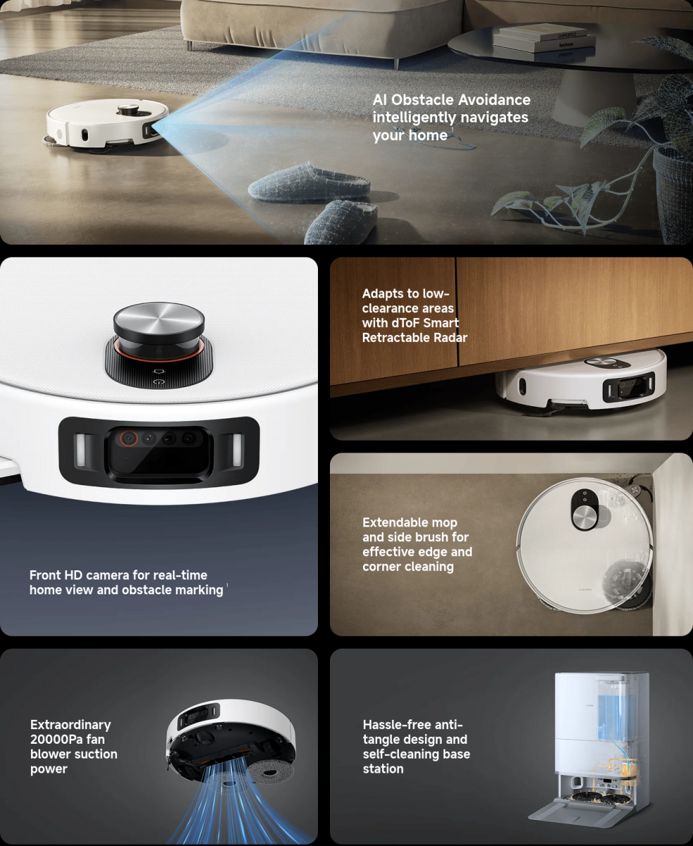 The robot vacuum is capable of identifying over 200 objects, including small obstacles such as USB cables, socks, and draping stems and leaves. It intelligently plans cleaning routes so you can enjoy flexible, worry-free cleaning.