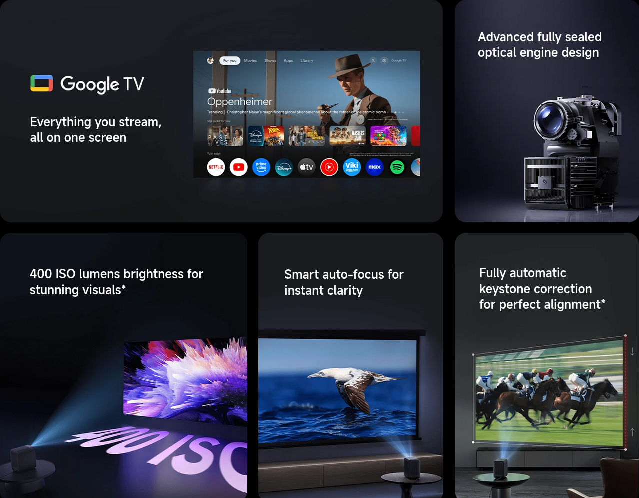 The fully-sealed optical engine adopts a high-definition optical lens featuring excellent light transmission, projecting clearer images with high colour accuracy to reproduce the true artistic beauty of films.