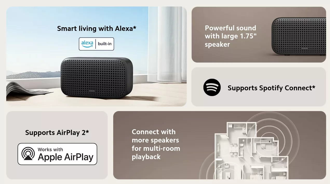 With Alexa multi-room or AirPlay 2, multiple speakers can be used in different rooms and simulcast the same music, radio stations, podcasts, and audio throughout the house.