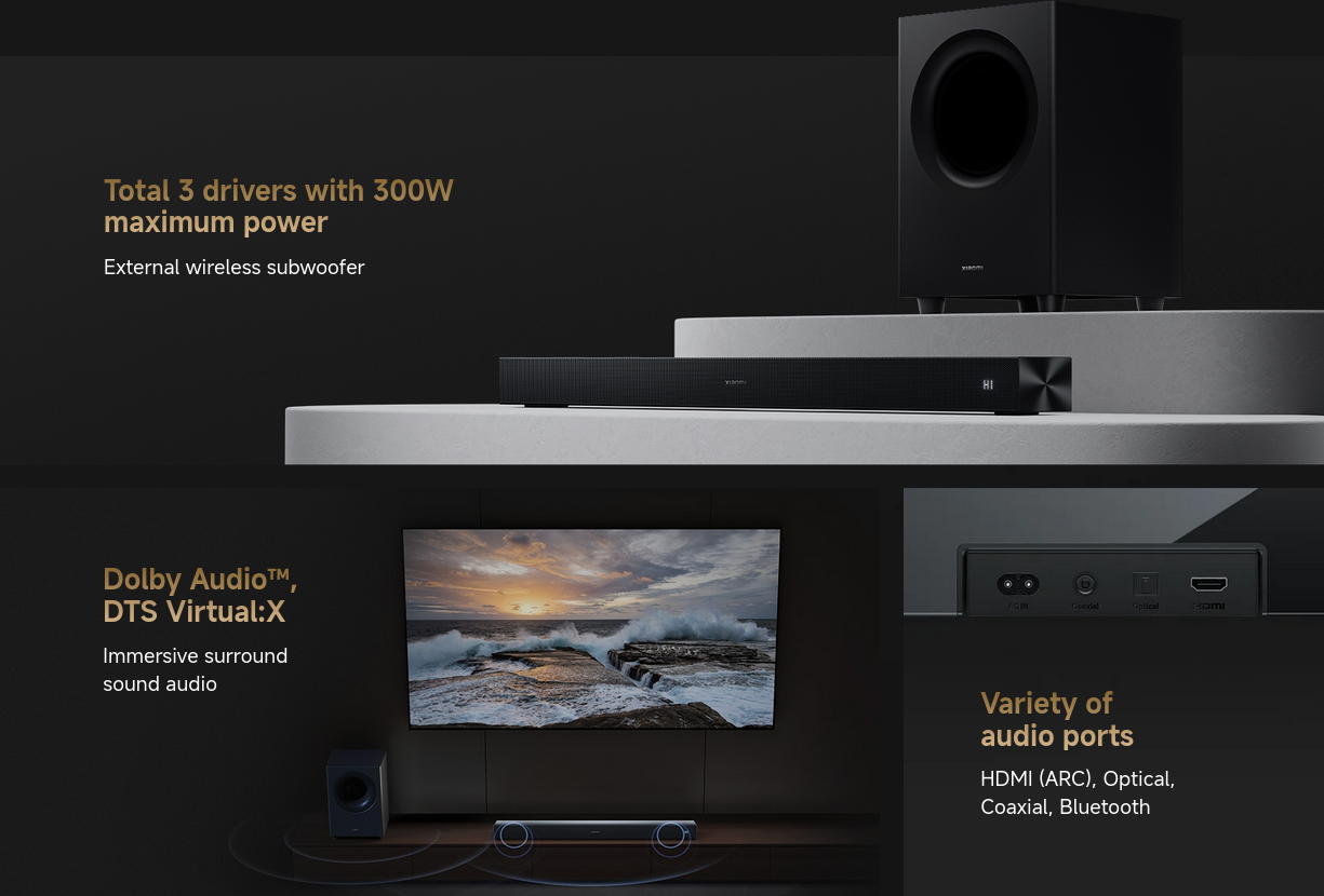 The external wireless super subwoofer enlarges the soundstage, providing detailed and rich sounds with clear separation of high, mid and low frequencies. Enjoy a cinematic auditory experience with powerful, deep bass.