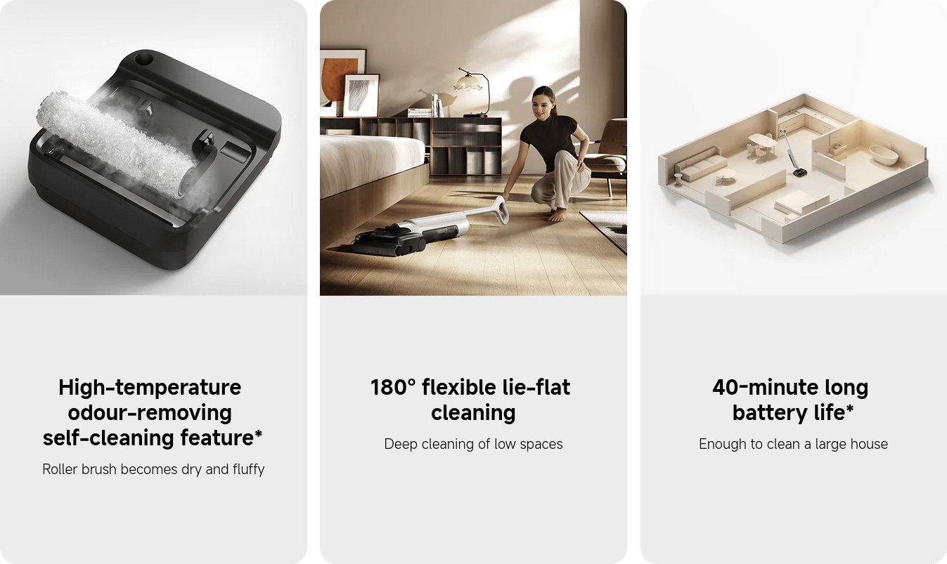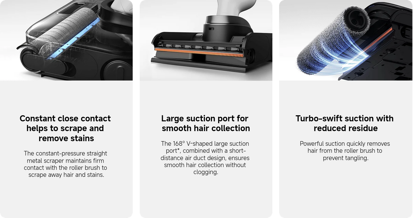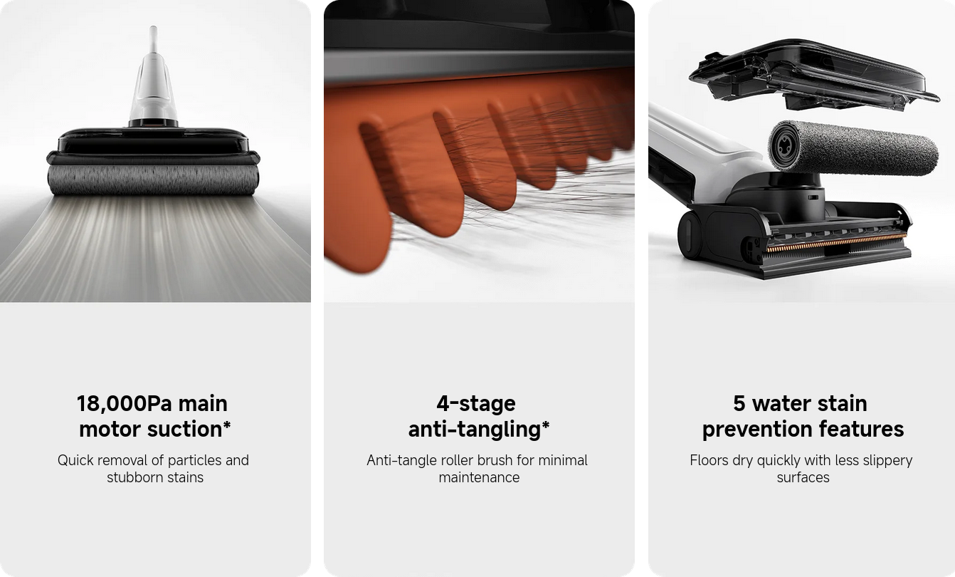Combining vacuuming, mopping and roller brush cleaning in one, it features a real-time clean water system to tackle hair, particles and stubborn stains simultaneously, eliminating the hassle of the traditional vacuum-before-mop routine.