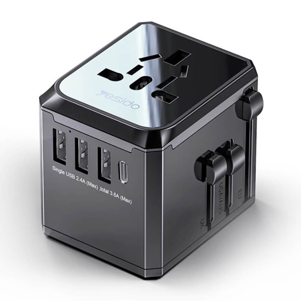 Захранване с 1xUSB-C и 3xUSB-A изхода и преходници за цял свят в едно устройство за мобилни устройства - Yesido Universal Travel Adapter (MC10) 18W (черен)