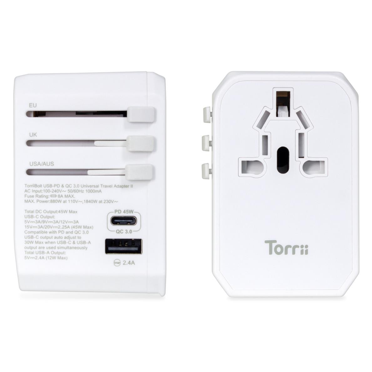 Плъзгащи се щепсели (съвместими за САЩ, Япония, Австралия, Китай, Великобритания и Европа) и универсален 100V-240V AC вход, позволяващи на пътуващите да свържат TorriiBolt Universal Travel Adapter II в повече от 150 държави
