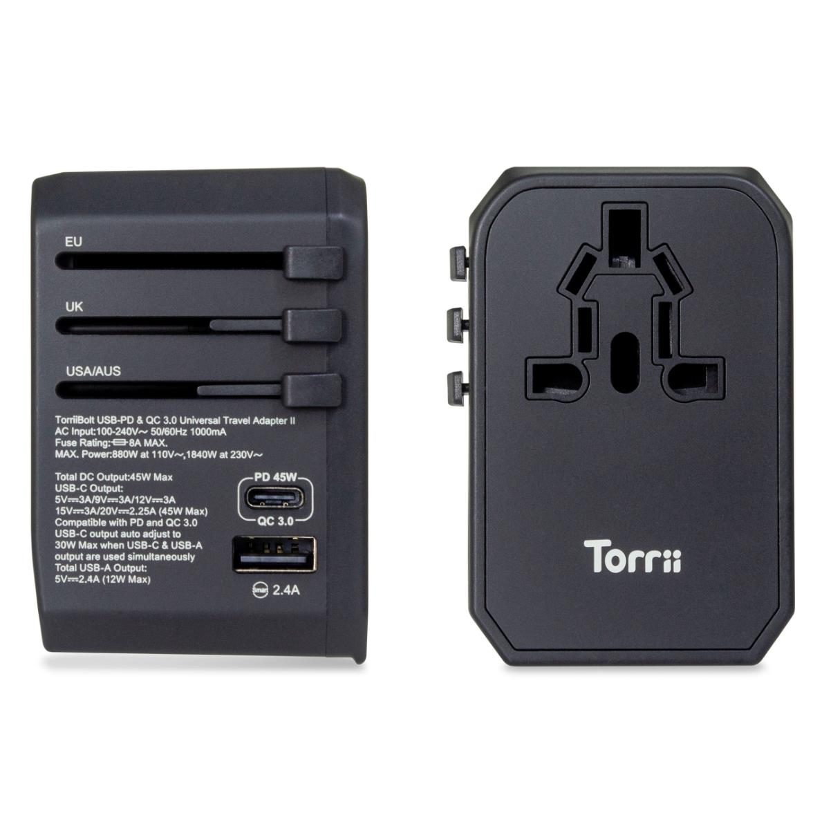 Плъзгащи се щепсели (съвместими за САЩ, Япония, Австралия, Китай, Великобритания и Европа) и универсален 100V-240V AC вход, позволяващи на пътуващите да свържат TorriiBolt Universal Travel Adapter II в повече от 150 държави