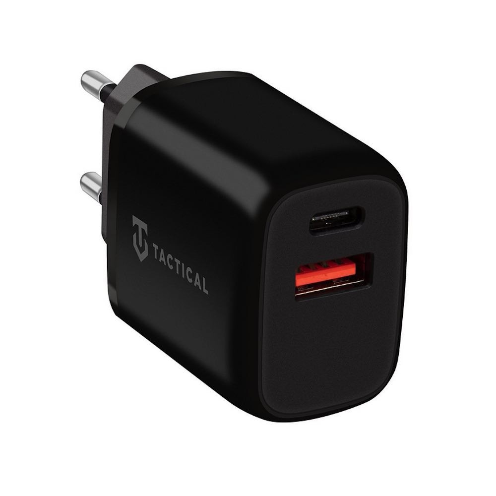 Захранване за ел. мрежа с USB-A и USB-C изходи и технология за бързо зареждане - Tactical Base Plug Dual Fast Wall Charger 20W (черен)
