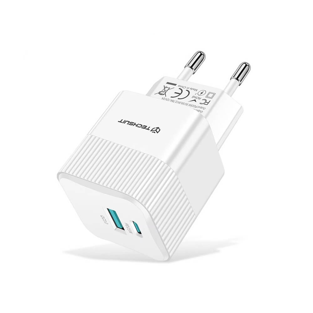Захранване за ел. мрежа с USB-A и USB-C изходи и технология за бързо зареждане - Techsuit Tiny Series ​​GaN Fast Wall Charger PD 25W (бял)